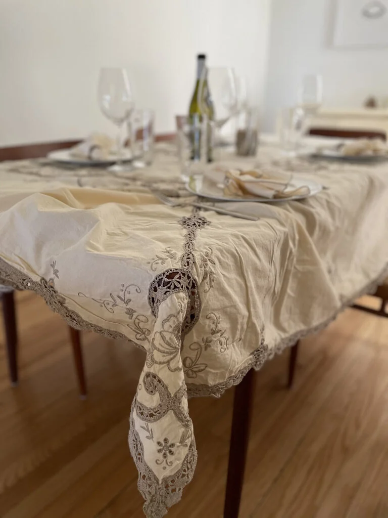 Your fabric doesn’t even have to be a traditional tablecloth: a linen sheet does the trick, and layered placemats or runners can be just as effective. Just stay away from synthetics.