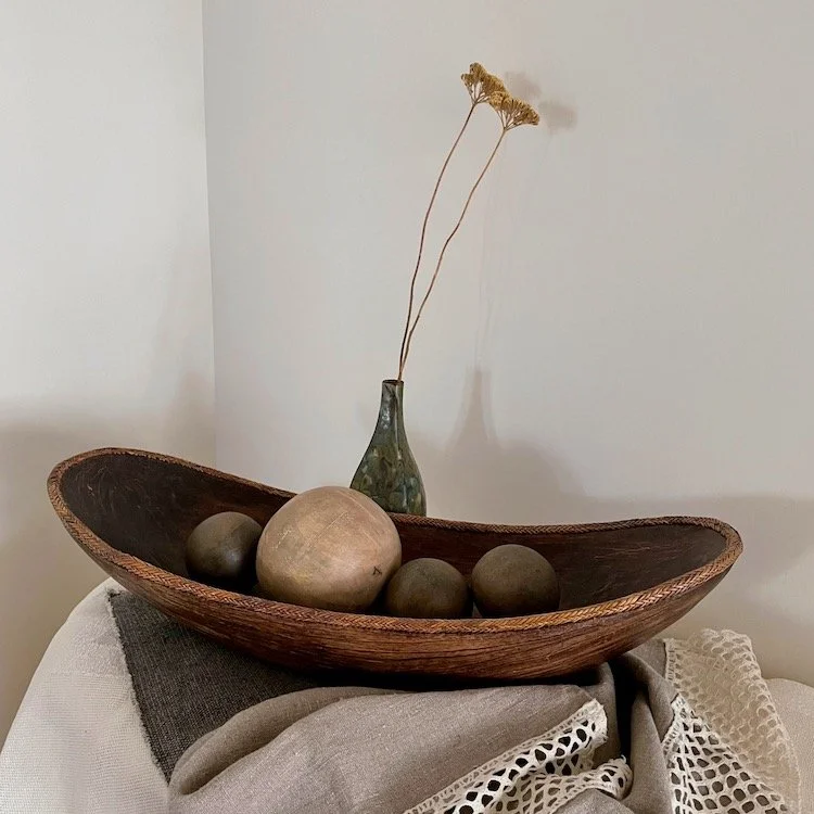 A country style vignette of carved wooden bowl, neutral linens, and dried flowers. Design: Time & Place Interiors
