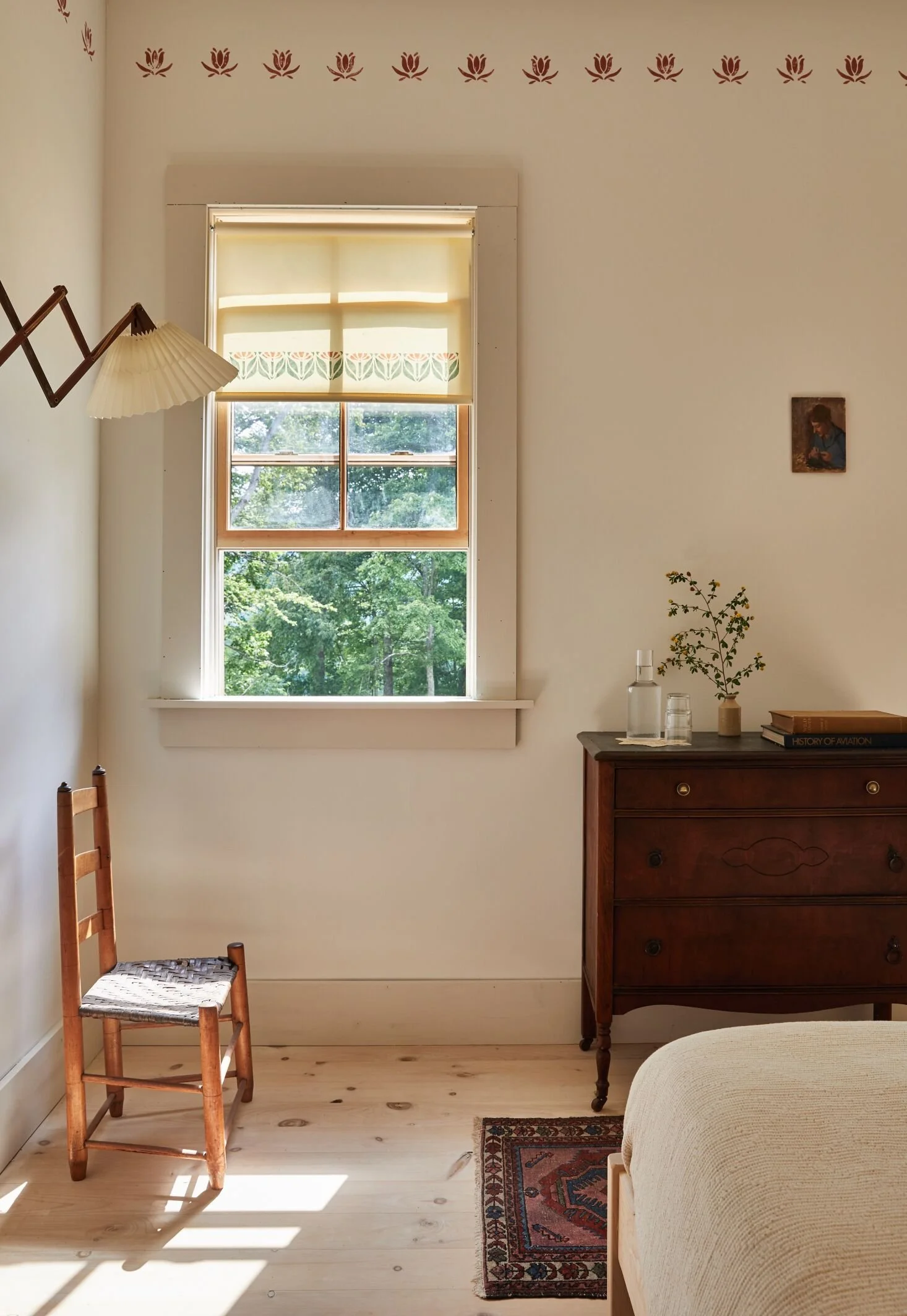 An antique chair with ticking fabric makes for an elegant corner in an Upstate country house guest bedroom. Design: Billy Cotton / Photo: Steven Kent Johnson