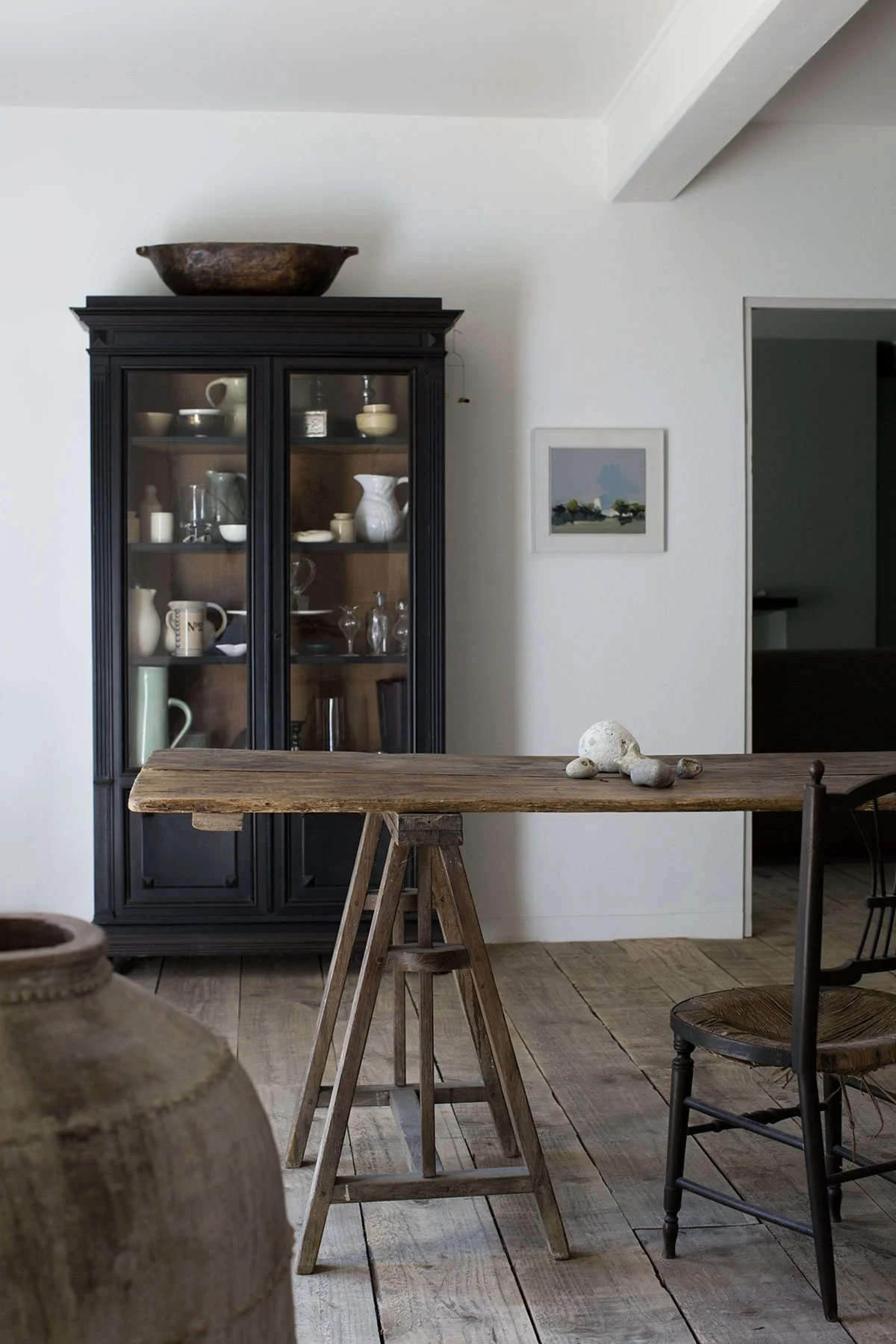 Simple designs like primitive furniture, a vintage Turkish rug, and Danish swing arm lamp are limited to a neutral color palette while emphasizing texture and shape. Design: Elizabeth Starks and Jacob Sackett / Photo: Christian Harder