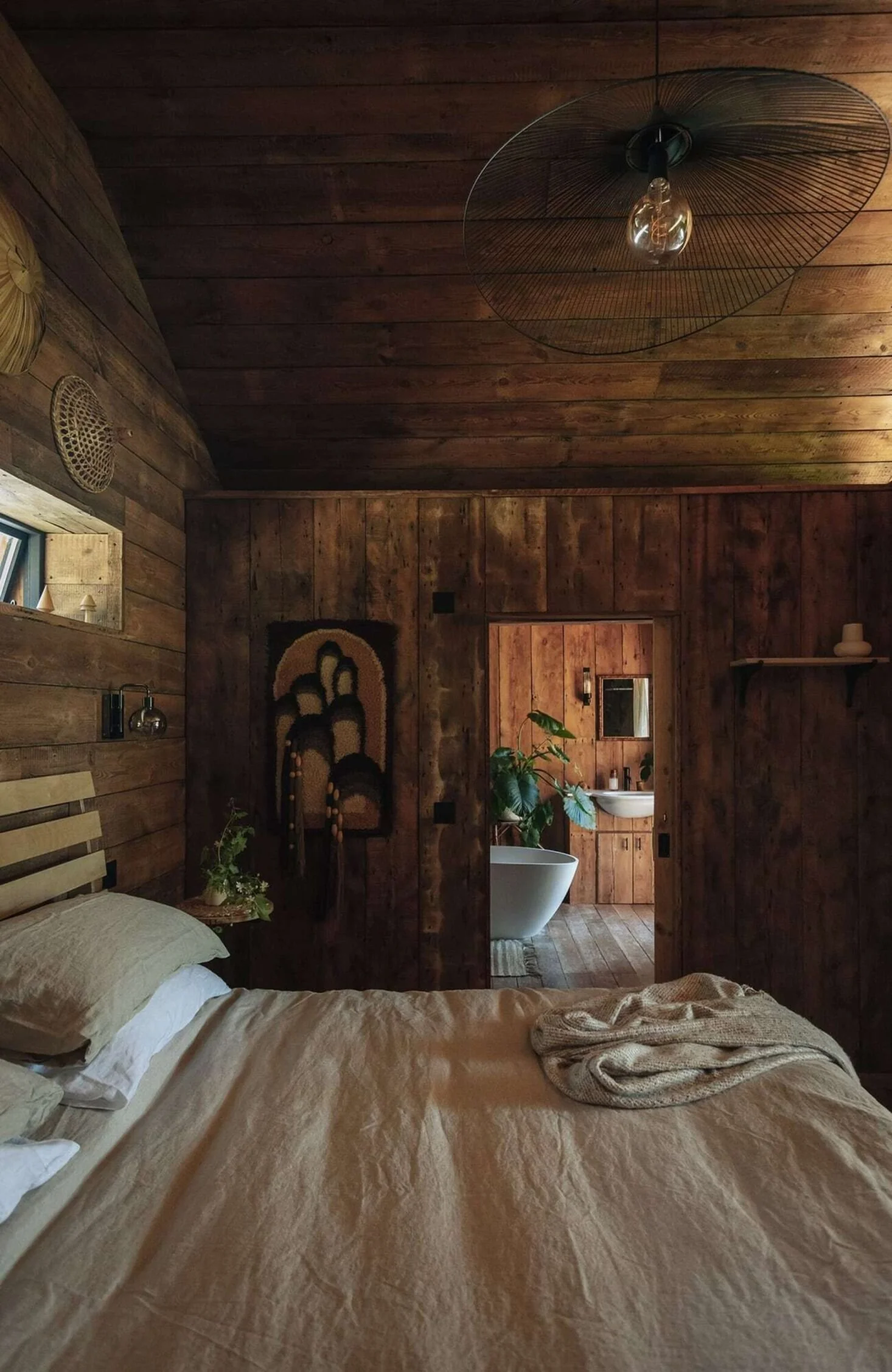 Layered neutral textiles in linen and wool create a feeling of comfort in a lakeside cabin whose walls are lined with salvaged wood. Points for the juxtaposition of a modern ceiling light. Design: Jo and John Morfoot for Settle / Photo: India Hobson of Haarkon