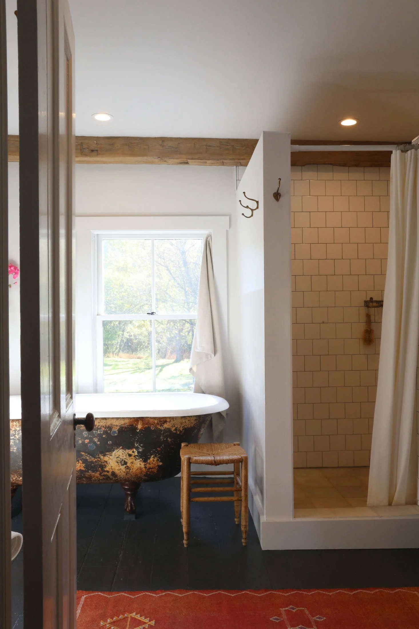 The outside of an antique claw-footed tub was smartly left unpainted in a Hudson Valley home. Design: Amanda Pays / Photo: Rebecca Westby
