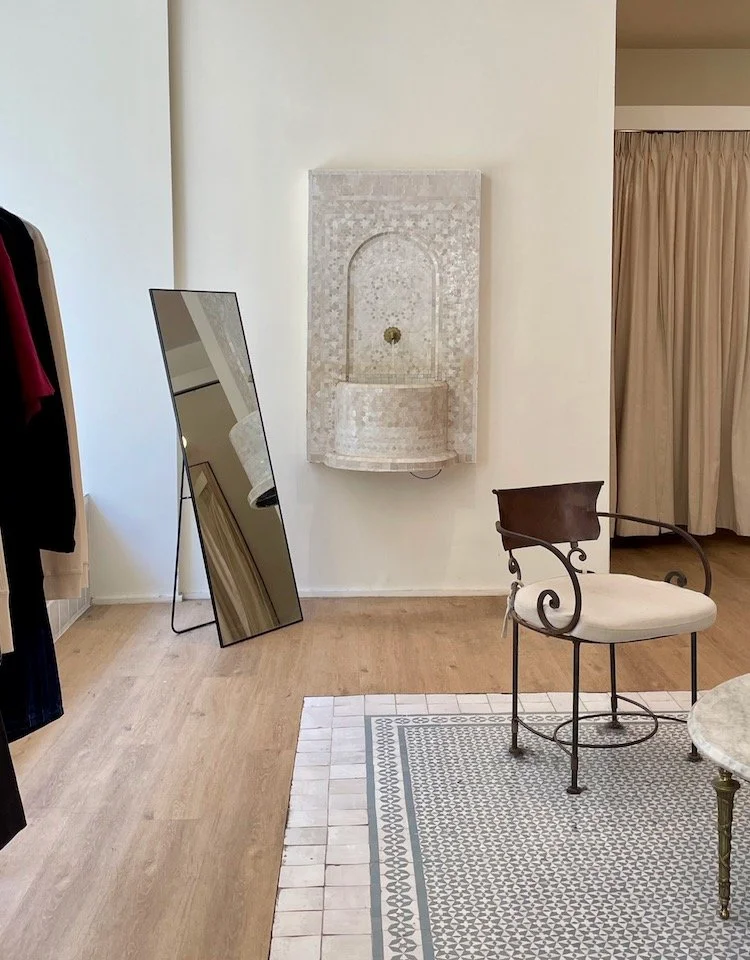 Enter a serene Mediterranean-like oasis at Kotn, with a fountain and courtyard-like area. The shop is a certified B-corp company offering apparel and homewares crafted from sustainably sourced Egyptian cotton and linen.
