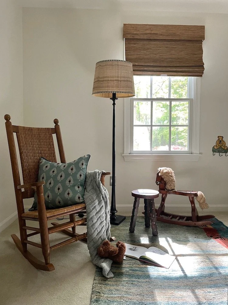 A soulful nursery I designed with a restored family heirloom rocker, Persian rug, vintage Brutalist stool, and English-style textiles. Design: Time & Place Interiors