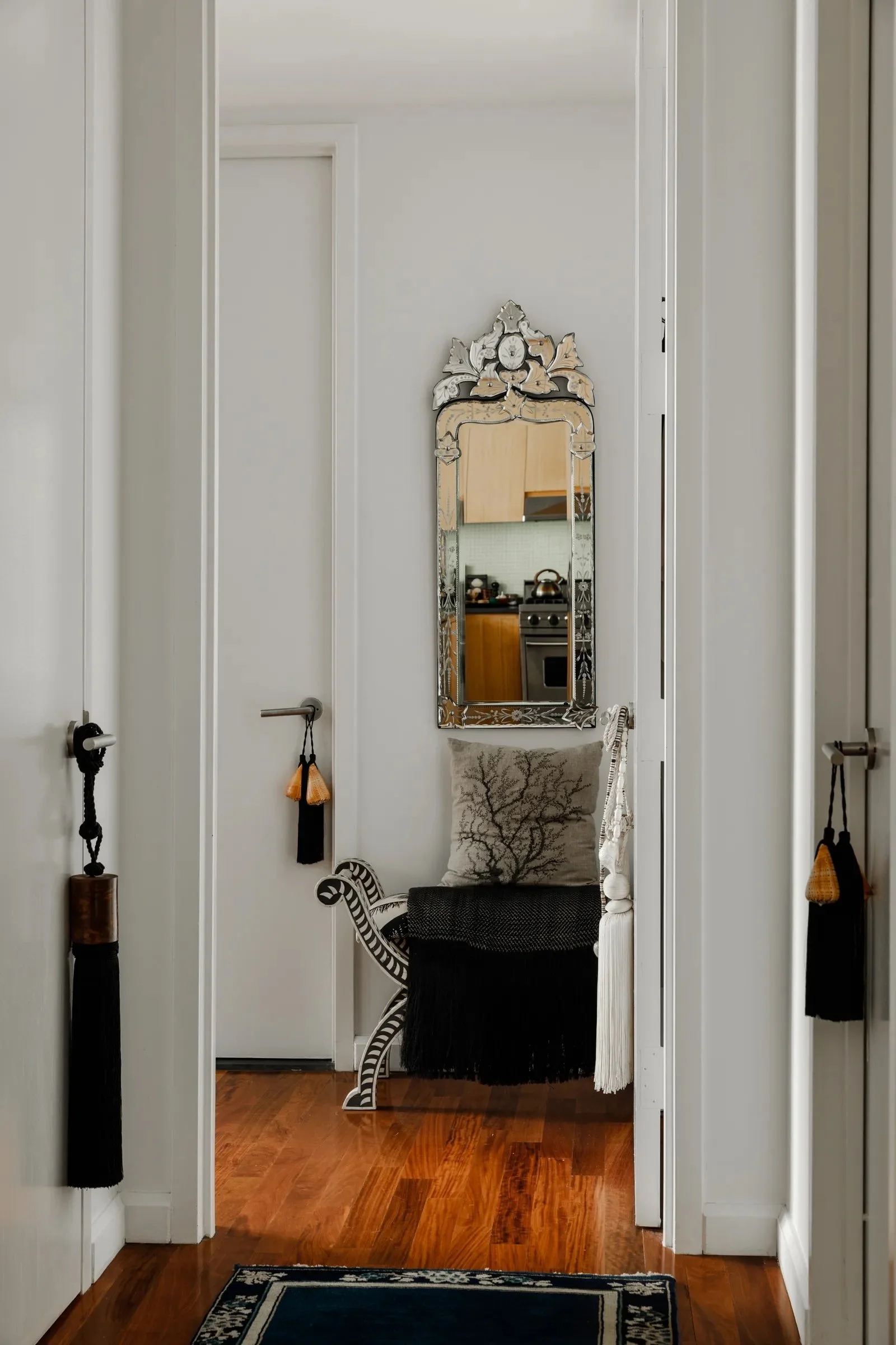 If your hallway is dark, try hanging a mirror perpendicular to the window in the adjacent room to bounce in some daylight. Here's a beautiful one in the style of Gio Ponti, echoing the vintage Italian designer chairs beyond of this New York bedroom. Design: Grisoro Studio / Photo: Kristen Frances