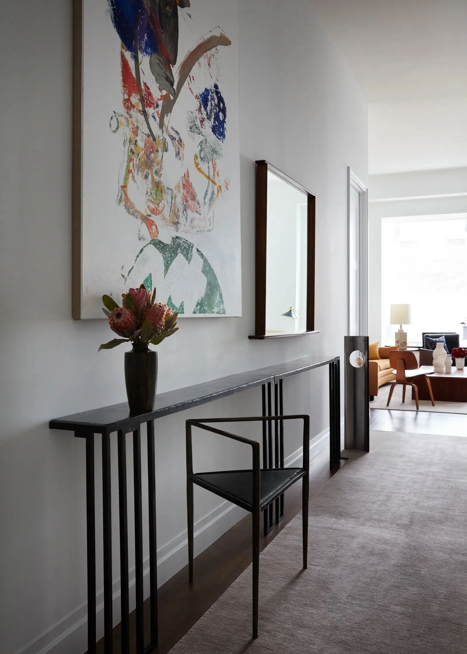 This hallway in a Manhattan high rise is big on style but low on space, so a wrought iron console table by J.M. Szymanski was custom designed for it. The side chair is by Rick Owens, the vase is 18th Century Japanese, and the artwork is New York-based artist Van Hanos. Further down is a George Nakashima mirror and a 1960s French floor lamp. Design: Andre Mellone / Photo: Stephen Kent Johnson