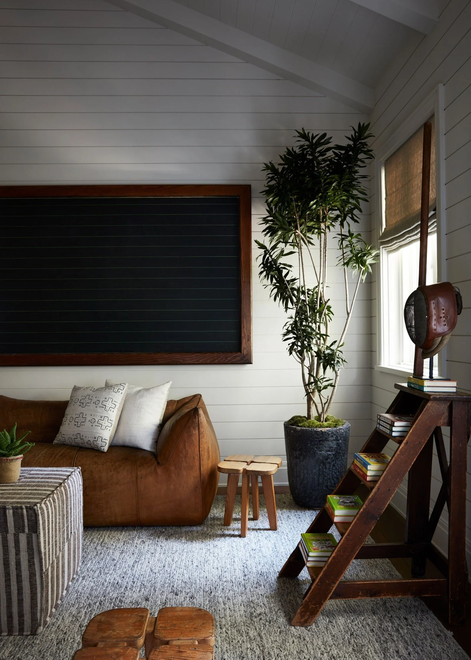If tucking everything away isn’t possible, fear not: you can display belongings in artful tableaux. Books, toys, kitchen utensils, and other mundane household items can be gathered into groups, interspersed with decorative objects, on open shelves or even stacked neatly on the floor. This is design for real life.