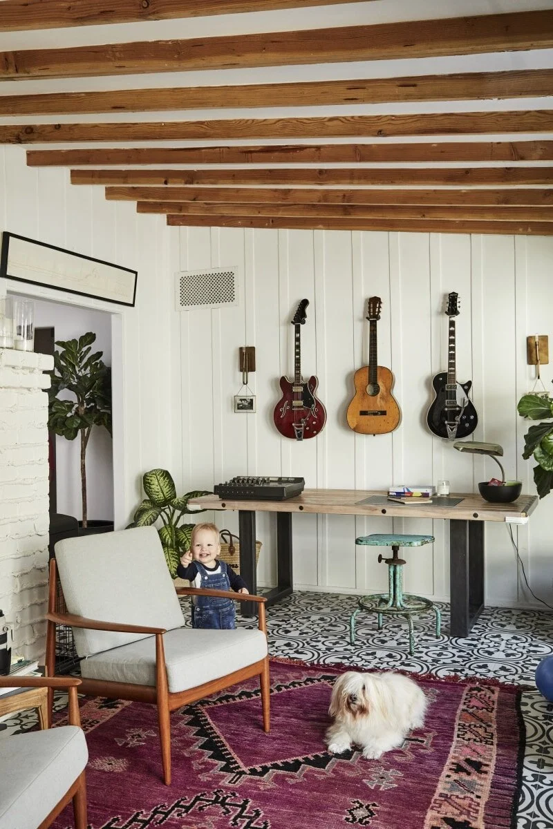 The homeowner’s guitar collection adds layered style to a room’s eclectic patterns and colors. Design: Deborah Gleiberman / Photo: Jenna Peffley