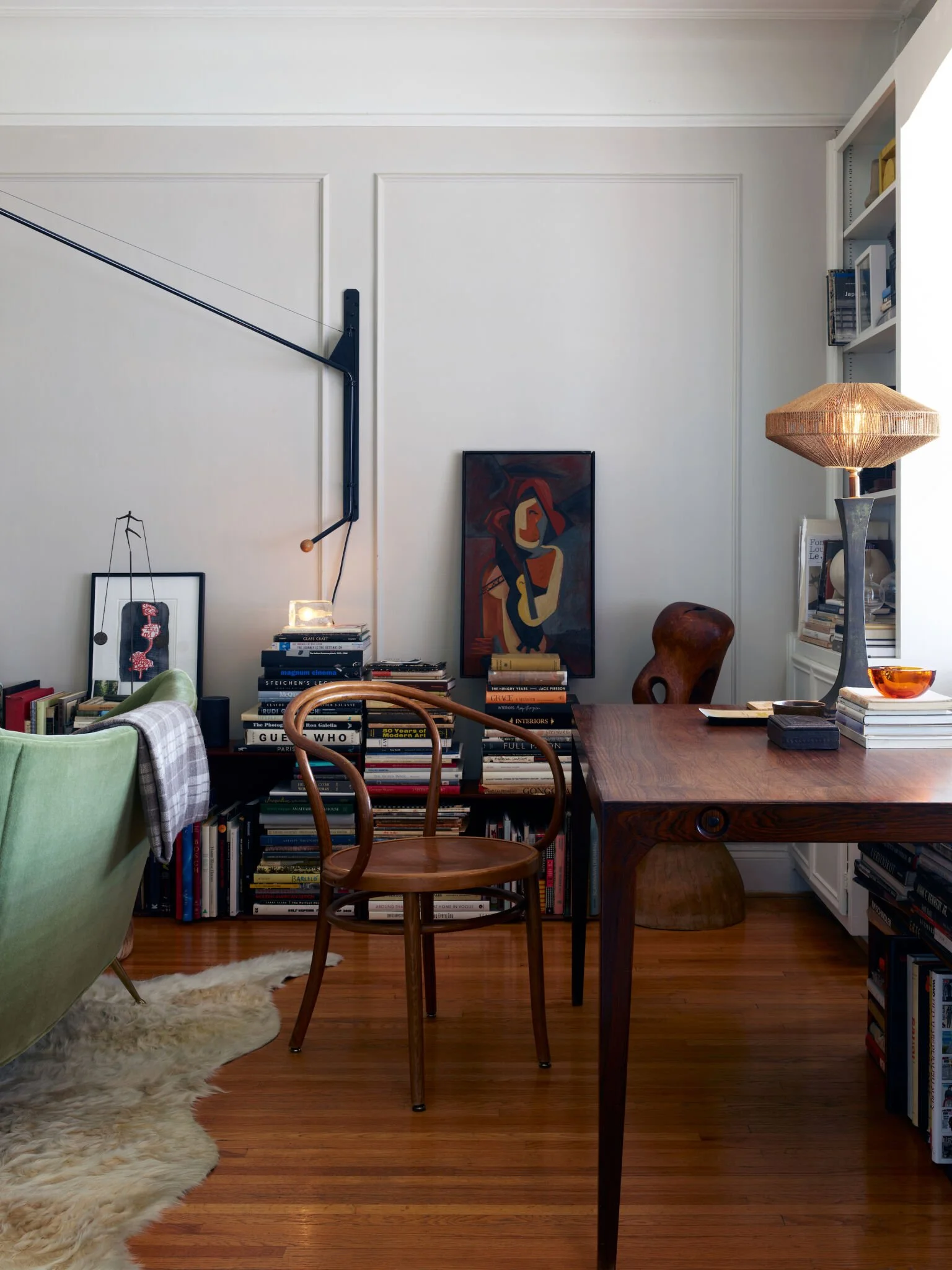 Books piled up in stacks make for surfaces to hold artworks and lighting. Design: Scott Newkirk / Photo: Chris Edwards
